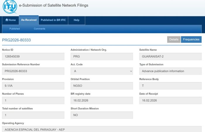 Nos complace anunciar que el pasado 17/02, se ha publicado en el Buró de Radiocomunicaciones de la Unión Internacional de Telecomunicaciones (ITU) la API (Advance Publication Information) como parte del proceso de coordinación de frecuencias de comunicaciones para la futura operación del satélite GuaraniSat-2.